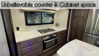 If cooking is a passion for you, look no further than our 38FKOK. This floorplan flaunts some of the largest countertops in the industry, making cooking preparations much easier. Along with a deluxe kitchen set up, this layout gives you a living room that comfortably seats up to 6 people. Let's not forget about the king sized bed and modern outside kitchen that are a standard offering.
